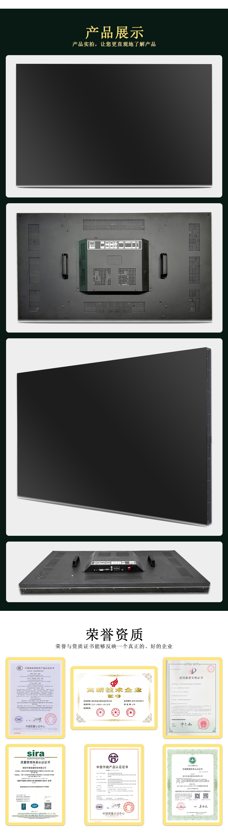 【美佳愛-4k液晶拼接屏生產廠家電話400-997-9971】原裝LG49寸液晶拼接屏1.8mm700cd產品通過ISO9001_3C_節能認證等30多項認證,主營LG/京東方/三星大屏幕電視墻,其尺寸有32寸40寸43寸46寸49寸55寸65寸75寸液晶拼接單元,也有曲面,弧形,柔性,無縫LED顯示屏,顯示器,超窄邊高清監視器,提供企業展廳展示,KTV,酒吧,會議室,視頻監控系統解決方案設計-報價-安裝施工-售后超窄邊維修等服務
