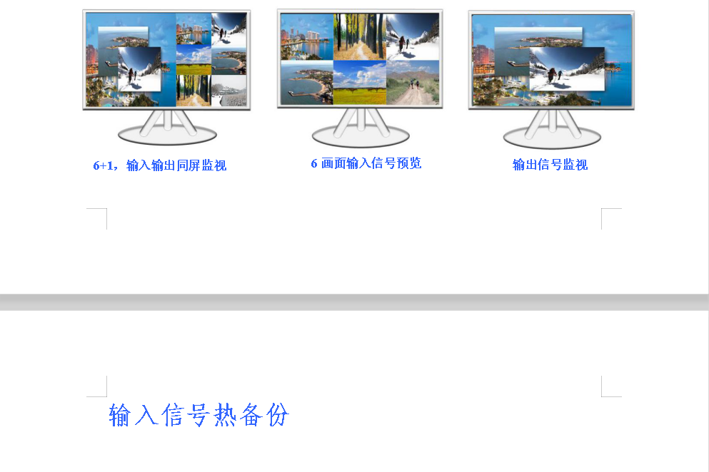 6+1畫面預(yù)覽和監(jiān)視 | ·用戶可以通過監(jiān)視器同時(shí)預(yù)覽6路輸入信號(hào),并可以同時(shí)監(jiān)視當(dāng)前的輸出畫面 |