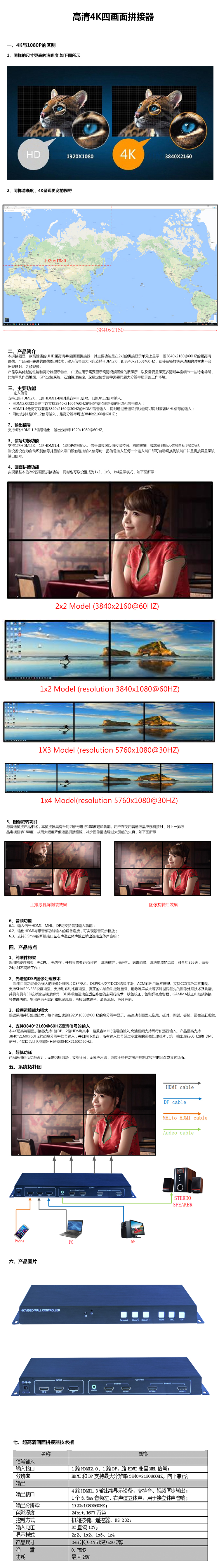 本產品是定制化的4K畫面拼接器,其主要功能是在M x N的拼接顯示單元上顯示一幅3840x2160@60HZ的超高清4K圖像。產品采用先進的圖像處理技術,輸入信號最大可以支持HDMI2.0,即3840x2160@60HZ,即使在播放快速動畫的時候也不會出現延時、丟幀現像。