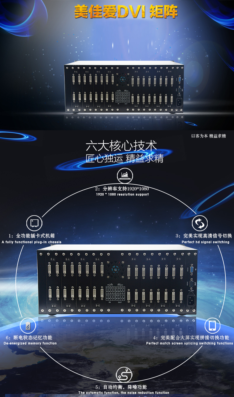 DVI高清全數字矩陣切換器, 所有端口支持藍光DVD(支持HDCP);輸入輸出自動均衡,輸入加輸出傳輸距離大于40米(不需配帶芯片的DVI線);鋁拉絲面板,帶藍光液晶顯示屏顯示操作狀態;帶串口控制,可選配網口;所有輸入端口支持現場寫EDID,所有輸出端口可讀回EDID。