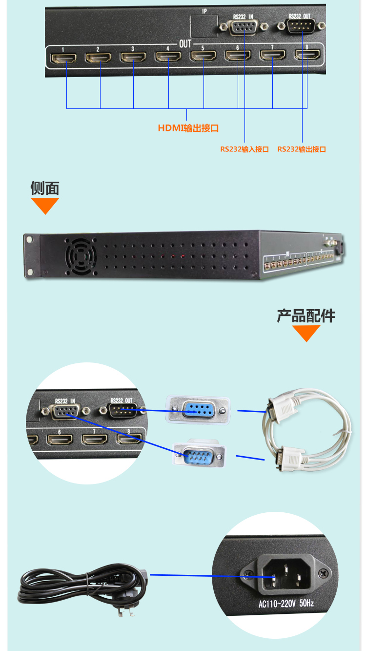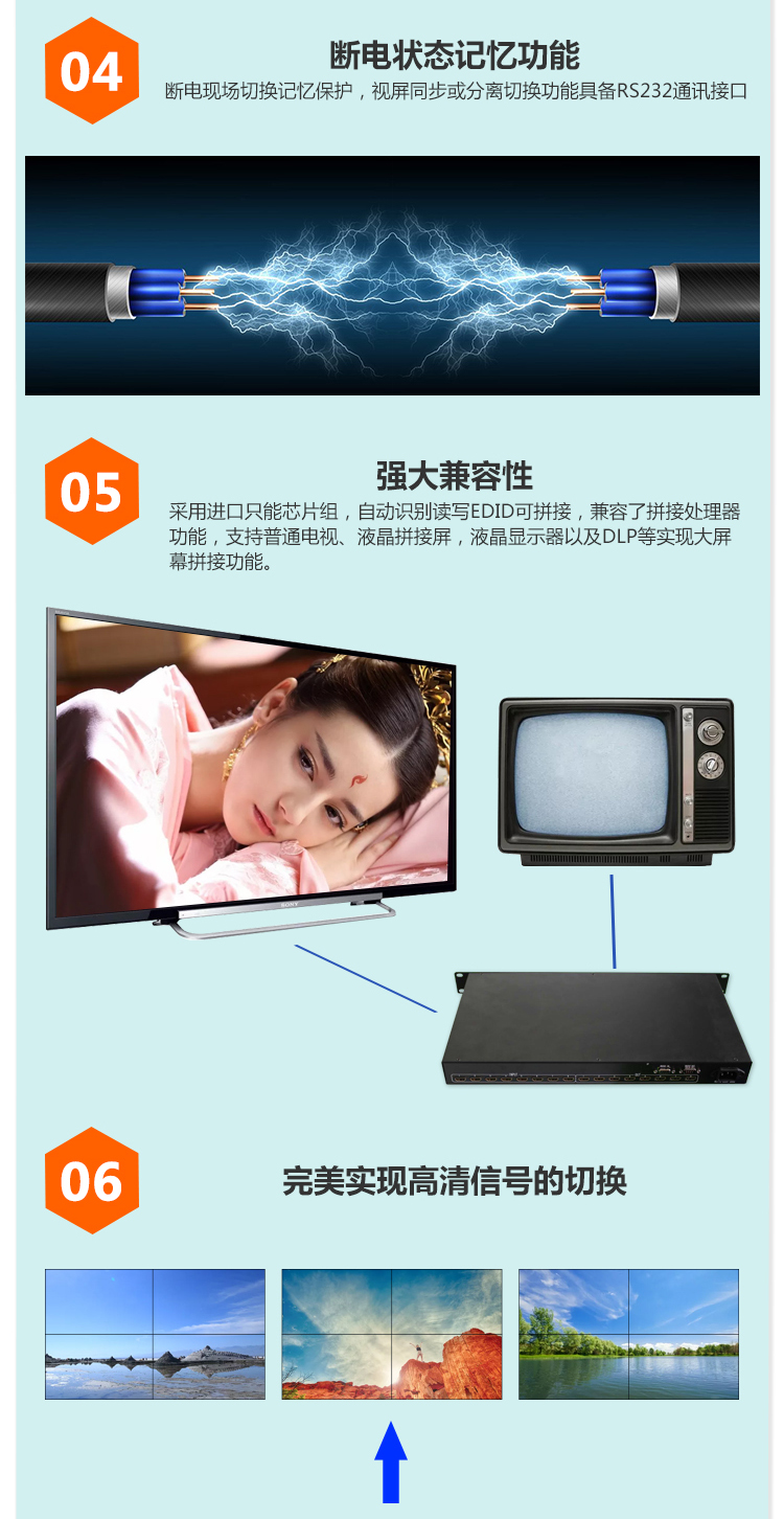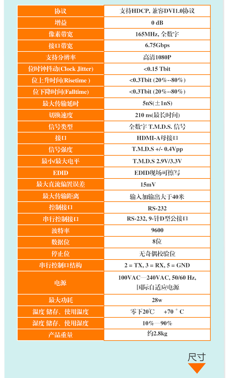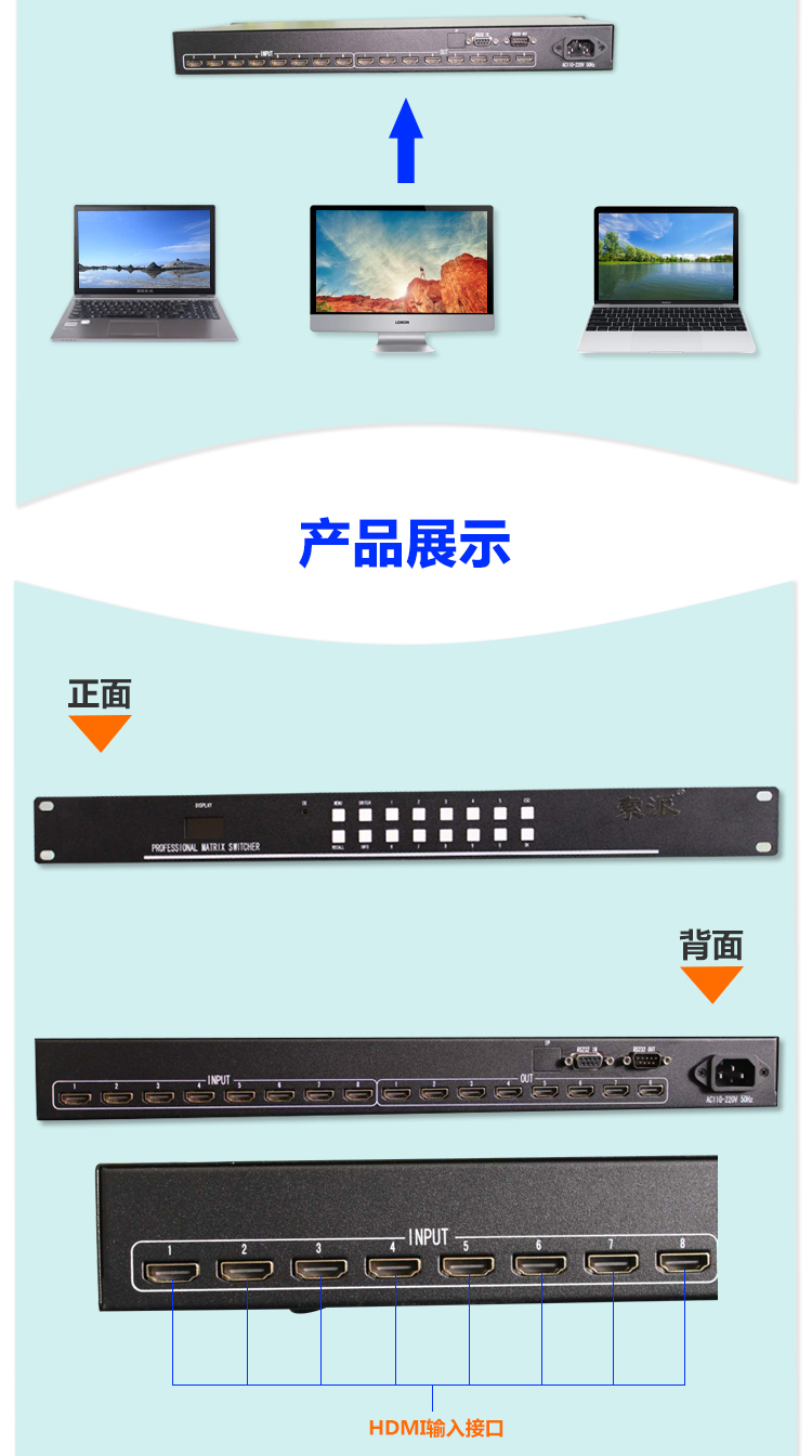 -HDMI高清全數字矩陣切換器, 所有端口支持藍光DVD(支持HDCP);輸入輸出自動均衡,輸入加輸出傳輸距離大于40米(不需配帶芯片的HDMI線);鋁拉絲面板,帶藍光液晶顯示屏顯示操作狀態;帶串口控制,可選配網口;所有輸入端口支持現場寫EDID,所有輸出端口可讀回EDID。