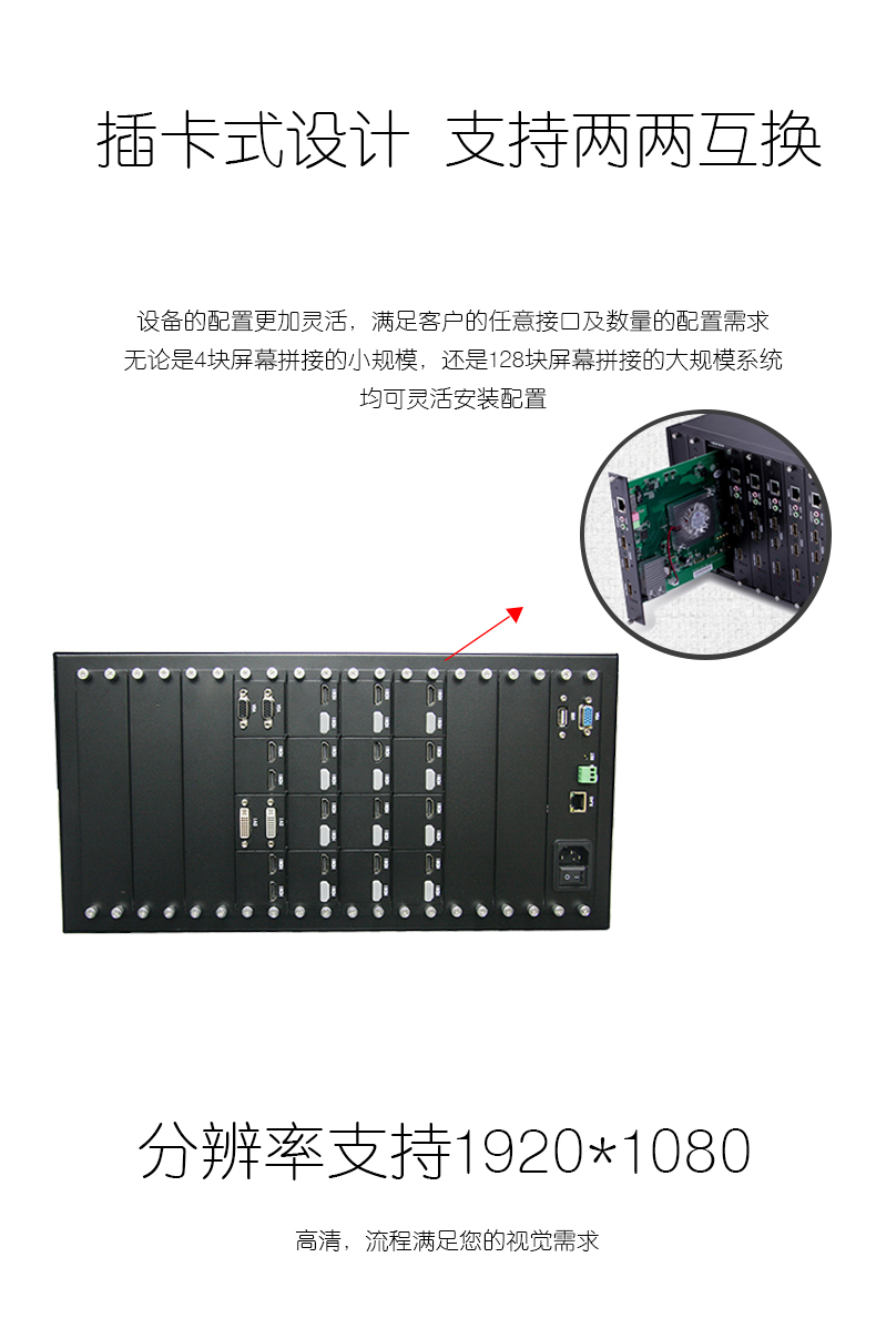 輸入板、輸出板、切換板、風扇、電源、防塵網等主要模塊均為插卡式設計,為日常使用及維護帶來了極大的方便。